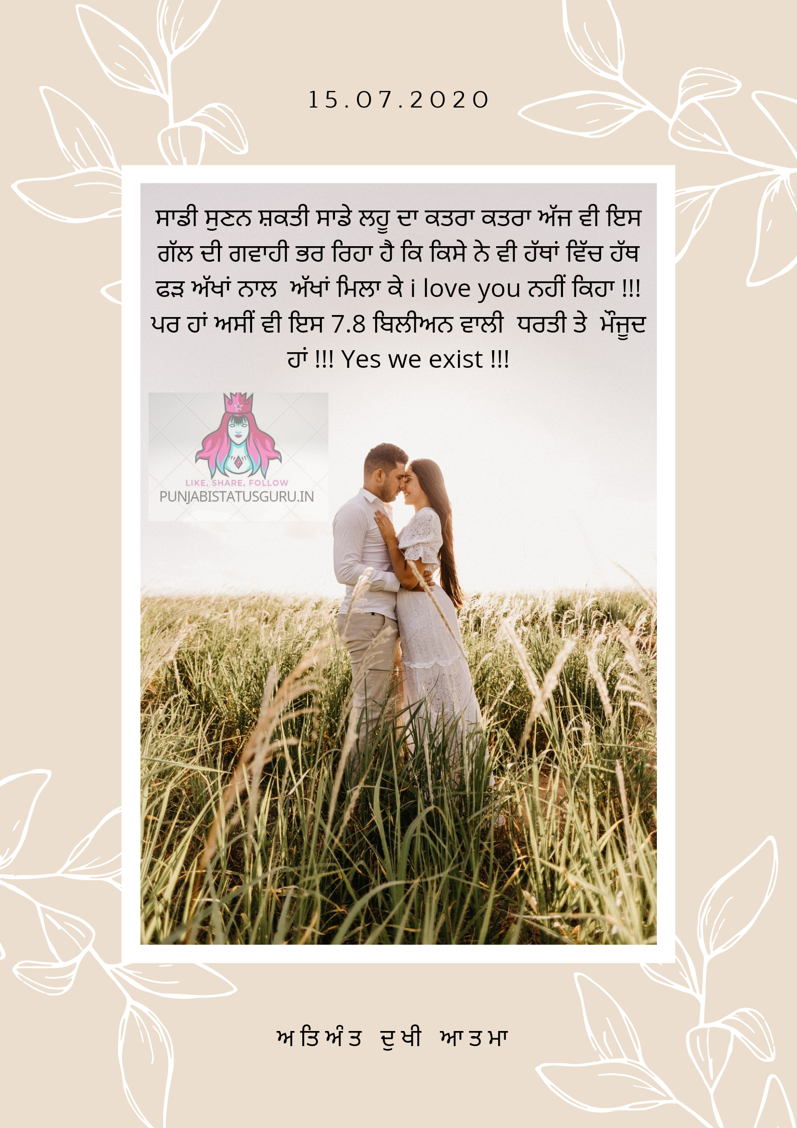 ਸਾਡੀ ਸੁਣਨ ਸ਼ਕਤੀ ਸਾਡੇ ਲਹੂ ਦਾ ਇੱਕ ਇੱਕ ਕਤਰਾ ਅੱਜ ਵੀ ਇਸ ਗੱਲ ਦੀ ਗਵਾਹੀ ਭਰਦਾ ਹੈ ਕਿ ਕਿਸੇ ਨੇ ਵੀ ਅੱਜ ਤੱਕ ਹੱਥਾਂ ਵਿਚ ਹੱਥ ਫੜ ਅੱਖਾਂ ਨਾਲ ਅੱਖ ਮਿਲਾ i love you ਨਹੀਂ ਕਿਹਾ ਹਾਂ ਅਸੀਂ ਵੀ ਇਸ 7.8 ਬਿਲੀਅਨ ਆਬਾਦੀ ਵਾਲੀ ਧਰਤੀ ਤੇ ਮੌਜੂਦ ਹਾਂ yes we are exist ਅਸੀਂ ਮੌਜੂਦ ਹਾਂ